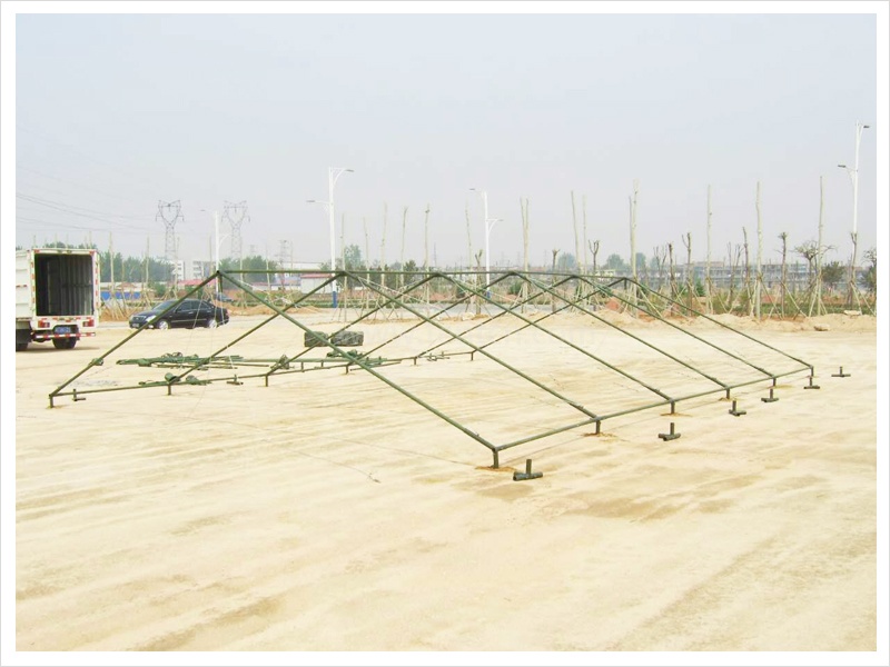 帳篷為雙坡面直墻式框架結構,篷架全部采用插接式構造,柱底四周設有落地桿??赏瑫r滿足75人就餐和75人五日份主副食儲放的基本功能要求。帳篷結構簡單、零部件通用性好,展開方便。篷內設有高反射材料隔熱吊頂,山尖設有三角通風窗,門窗開啟面積較大并設有紗網,夏季篷內無明顯的烘烤感和過熱現象。包裝件形態(tài)規(guī)則,便于裝載運輸。